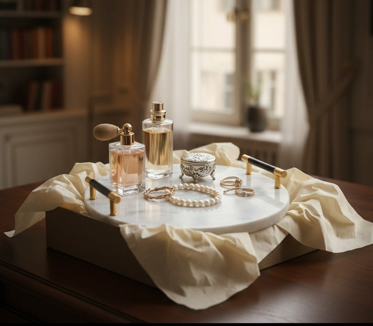 Whether you're showcasing your designer perfumes, curating your vanity essentials, or serving gourmet appetizers, this marble tray seamlessly blends beauty and function. Enhanced with sleek brass-finished handles for a modern touch, it becomes the ultimate addition to your dressing table, coffee table, console, or bathroom counter.
