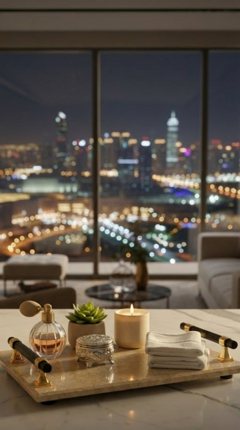 I'm low-key obsessed with this luxury cream marble tray! It's the perfect addition to my vanity and adds the required stylish vibe I needed in my bedroom 😍😍😍